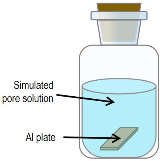 For the analysis of the mechanism of corrosion inhibition of PAS on the Al plates in OPC pastes, Al plates sized 1 × 15 × 5 mm3 were immersed in the simulated pore solution listed in Table 4 in sealed bottles, as illustrated in Figure 3. The pH and aluminium ion concentrations of the simulated pore solution were measured up to 16 h. Then the Al plates were removed from the simulated pore solutions, and the surfaces were observed under SEM with the element distribution characterised by EDX. The mineral assemblage of corrosion products on the surface of Al plates was characterised by XRD.
