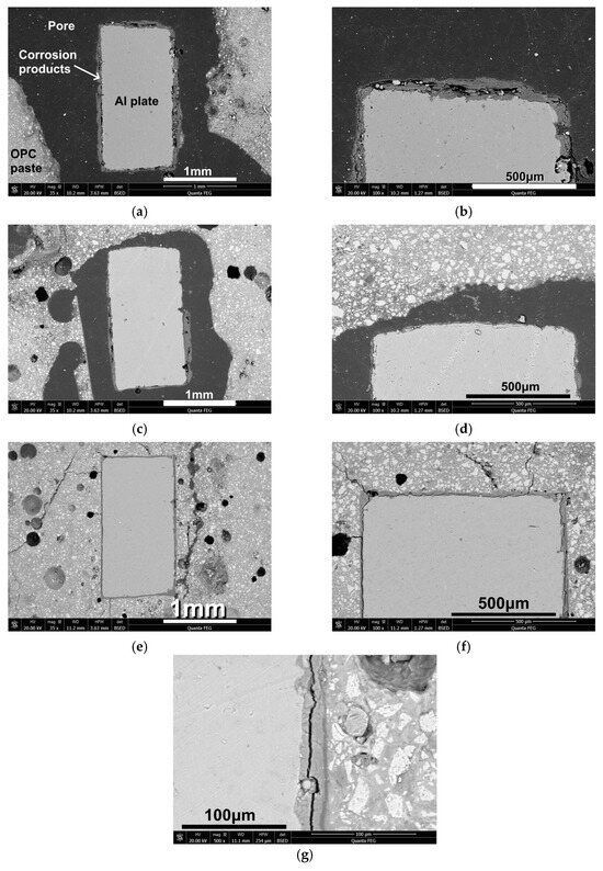 SEM BSE images of Al plates in hardened OPC pastes with various amounts of PAS hydrated at 3 days: (a) and (b): PC-P0; (c) and (d): PC-P3; and (e–g): PC-P6 samples.
