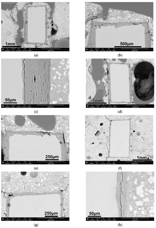 SEM BSE images of Al plates in hardened OPC pastes with various amounts of PAS hydrated at 28 days: (a–c): PC-P0; (d) and (e): PC-P3; and (f–h): PC-P6 samples.