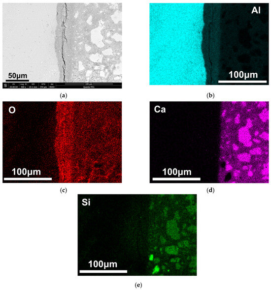 The element distribution map of the PC-P6 sample with the Al plate was obtained by EDX and is shown in Figure 7. According to these element distribution maps, the corrosion products contained aluminium and oxygen. There was no aluminium diffused into the matrix of OPC paste to form a new product, and there was no calcium or silicon diffused into the corrosion product layer either. It seems that the type of corrosion product was not altered by the hydration of OPC. The hydration of OPC paste was not affected by the corrosion of the Al plate either.