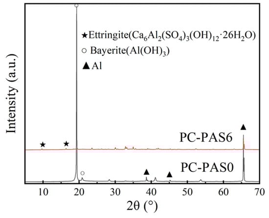 The corrosion rates (Figure 13b) of the Al plate in PP0 and PP2 were calculated according to the Tafel method. The corrosion rate in PP0 was 288.30 mm a−1, and that in PP2 was 1.35 mm a−1, indicating that the corrosion rate of the Al plate was 213 times slower with the addition of PAS than that in the OPC paste. These results show that the addition of PAS in OPC paste could greatly inhibit the corrosion of Al alloy in the hardened OPC paste.