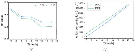 For the change of Al ion concentration (Figure 9b), the initial Al ion concentration of PP2 was higher than that of PP0 due to the hydrolysis of PAS, which released Al(OH)4− ion into the simulated pore solution. The Al ion concentration of both PP0 and PP2 increased with the time of immersion of the Al plate, indicating that Al plates reacted with the simulated pore solution. This reaction resulted in the release of Al(OH)4− into the solution from Al plates. By 16 h of immersion, the Al ion concentrations in both PP0 and PP2 were similar.