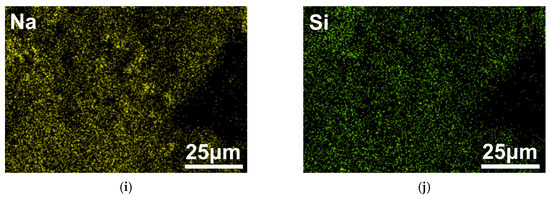The microstructure and elemental mapping of Al plates immersed in PP0 and PP2 simulated pore solution were characterised by SEM-EDX and are shown in Figure 10. There were layers of corrosion products on the surface of Al plates in both PP0 and PP2 simulated pore solutions. A porous corrosion layer with pores sized approximately 40 μm was observed on the surface of the Al plate in PP0 (Figure 10a–e). These big pores will favour the transportation of the alkaline solution to the surface of the Al plate, resulting in continuous corrosion. The corrosion layer of the Al plate in PP2 showed fewer pores with a dense structure (Figure 10f–j), which could inhibit further corrosion once the corrosion layer formed. The dense corrosion layer will prevent the transportation of the simulated pore solution to the surface of the Al plate.