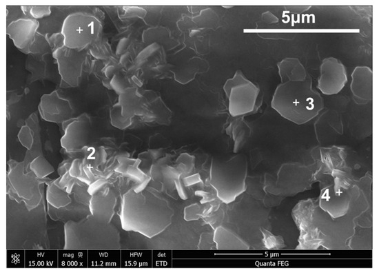 Morphology of corrosion products and position of point analysis (position 1–4) of the chemical composition of the Al plate in PP2 for 16 h.