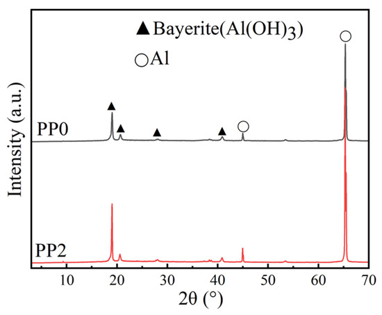 According to the elemental mapping of both Al plates in PP0 and PP2, the chemical compositions of corrosion products were similar, but the elemental mappings for PP2 were more homogeneous compared to those in PP0. There was some uneven distribution of sodium for the Al plate in PP0. These results elucidate that the corrosion inhibition effect could be due to the formation of a dense layer of corrosion products on the surface of the Al plate, rather than the alternation of corrosion products. Point analysis of the chemical composition of corrosion products on the surface of the Al plate in PP2 further confirmed the formation of bayerite (Figure 11 and Table 5). The mineral phases on the surface of Al plates immersed in PP0 and PP2 for 16 h were identified by XRD and are shown in Figure 12. These XRD patterns also confirmed that the corrosion products in both situations were bayerite.