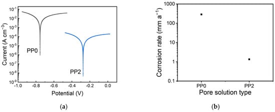 The polarisation curves and the calculated corrosion rate of Al plates in both PP0 and PP2 were measured and calculated, as shown in Figure 13. According to the polarisation curves of Al plates in PP0 and PP2 (Figure 13a), the shape and tendency of both polarisation curves were similar. These results show that the addition of PAS did not alter the corrosion mechanism of the Al plate in the simulated pore solution of OPC paste, although the corrosion potential was changed by the addition of PAS.
