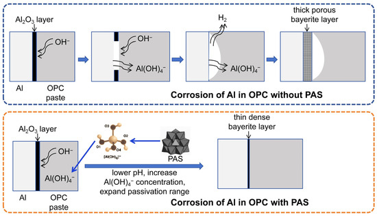 According to the results obtained and the discussions, the inhibition of Al alloy corrosion in OPC paste by the addition of PAS could be illustrated in Figure 14. For the Al plate in OPC paste without the addition of PAS, the high pH of the pore solution of the OPC paste induced the corrosion of the oxide layer and metallic aluminium. Hydrogen gas was released and Al(OH)4− was released into the pore solution. A thick, porous layer of bayerite was formed on the surface of the Al plate, favouring the continuous corrosion of Al alloy. The release of hydrogen gas and formation of a porous bayerite layer resulted in the expansion and cracking of the OPC paste.