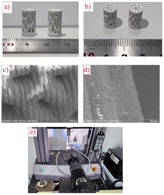 (a,b) Three-dimensional printed samples after sintering. (c,d) SEM images of samples at different magnifications. (e) Compressive test setup with a microscopic lens.