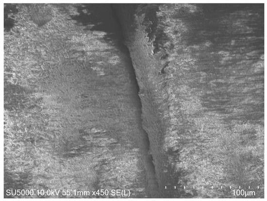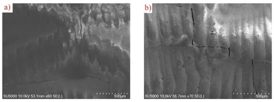 Figure 7a,b presents the SEM analysis revealing the crack propagation and failure mechanism of the hollow sample at a strain of (0.005). The cracks initiated parallel to the loading direction until reaching the weak bonding interface of the printing layers, which changes its direction and propagates between layers. This observation underscores the significant impact of printing defects in the mechanical properties [35].