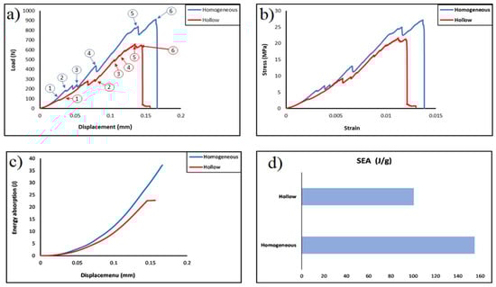 (a) Load–displacement curve (numbers 1 through 6 represent the same corresponding failure stages in Figure 4); (b) stress–strain curve; (c) energy–displacement curve; (d) the specific energy of the two printed samples.