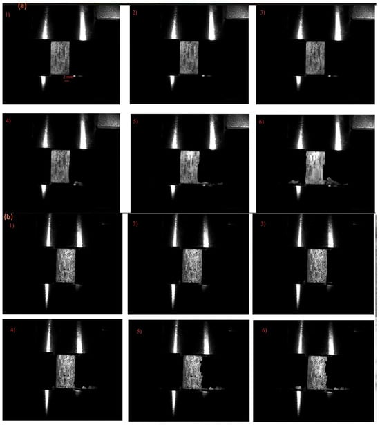 (a) Failure stages of the homogeneous sample. (b) Failure stages of the hollow sample. The numbers 1–6 refer to points 1–6 on the stress–strain curve in Figure 3.