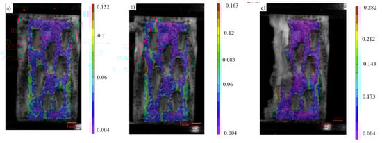 Figure 5 shows the Digital Image Correlation (DIC) analysis of the homogeneous sample. Initially, as the load is applied, strain is evenly distributed throughout the entire structure. However, as the load continues to increase, the highest strain becomes evident at the junction of the struts, as depicted in Figure 5b. It is from this point that structural failure starts, as illustrated in Figure 5c.