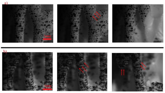 High magnification image of structures during loading: (a) homogeneous sample; (b) hollow sample.