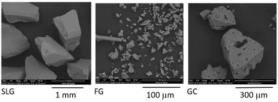 The transition temperature obtained from DSC indicates that SLG has the lowest transition temperature at 573 °C, while FG shows the highest at 670 °C, and the GC sample shows an intermediate value of 615 °C. SLG also exhibits a subtle devitrification peak at 913 °C. The GC sample revealed a melting temperature of 1268 °C, attributed to the melting of the crystalline phases contained in the sample. However, since the firing temperature for the studied samples was below 1180 °C, this thermal effect is considered negligible for this study. It is important to note that these thermal behaviors pertain to the pure glasses, and may differ when incorporated into the ceramic mix matrix. Further comparisons of these three selected glasses were made through SEM observation, with the corresponding backscattered electron images presented in Figure 4.