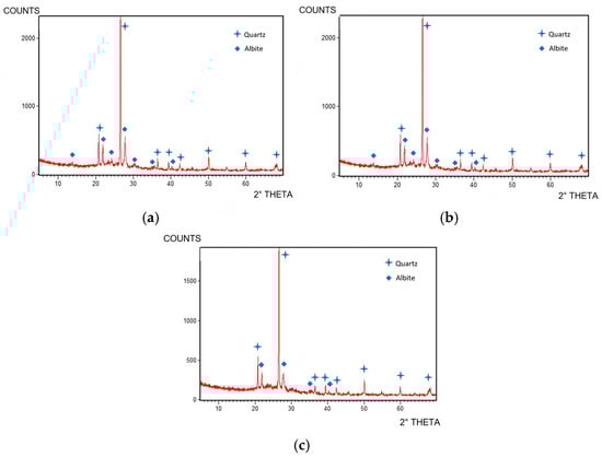 Figure 5 shows the XRD qualitative analysis of SLG samples fired at different temperatures. The primary crystalline phases are quartz (Ref. code 01-083-0539) and albite (Ref. code 01-076-0898). As the firing temperature increases, the intensity of the main peaks decreases, while the glassy phase becomes more pronounced at the highest temperatures. No mullite was detected, likely because the concentration of this crystalline phase in the samples was below the detection limit of the instrument (2%). This is due to the lower kaolin content in the clays, and the fact that the temperatures studied are lower than those typically used for porcelain stoneware slabs. Albite melted and contributed to an increase in the glassy phase, which was already present due to the soda–lime–silicate waste glass and other feldspars and clays in the composition.