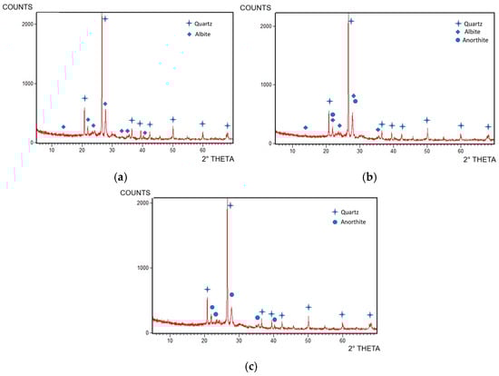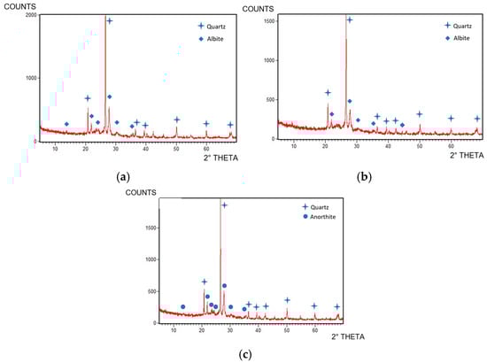 For the FG samples (Figure 6), as the temperature increased, albite melted, and at the highest temperature, a new crystalline phase, anorthite (Ref. code 00-020-0528), formed. This transformation occurred because FG contains a high amount of CaO (22%), which reacts with the glassy phase above 1170 °C, forming a CaO-rich crystalline phase. On the other hand, the glassy phase remained relatively consistent across all the samples.