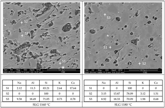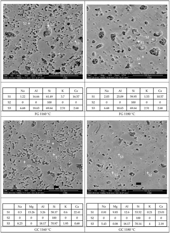 SEM images, as presented in Figure 8, were captured at high magnification to observe the microstructure evolution of the studied samples at two different temperatures, 1160 °C and 1180 °C. EDS semi-quantitative chemical analysis was also performed in situ, in specific areas, to understand the chemical nature of different phases. In the FG sample at 1160 °C, an irregular porosity can be observed, indicative of an incomplete sintering process, with no clearly visible glassy phase. However, at 1180 °C, the porosity changes, showing a more regular, rounded shape as the glassy phase promotes the sintering process. This sample also reveals small crystalline phases rich in Ca, Al, and Si oxides, probably anorthite, as indicated by the XRD results. The glassy phase formed during firing (from melting feldspar) and the fiberglass, which is richer in calcium, contributed to the formation of anorthite, which prevented complete sintering. A similar behavior was observed in the GC samples, though the sample fired at 1180 °C exhibited less porosity and a higher amount of glassy phase. Finally, for SLG samples, the low-temperature treatment at 1160 °C resulted in incomplete sintering, but as the temperature increased, the glassy phase became more prominent and the glass viscosity decreased, causing the pores to take on a spherical shape. In these samples, the SLG matrix did not form any new crystalline phases.
