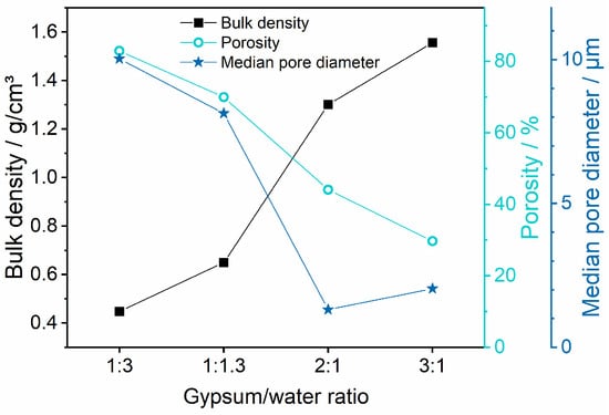 Bulk density, porosity, and median pore opening diameter of plaster mould materials prepared from varying gypsum/water ratios, determined via mercury intrusion porosimetry.