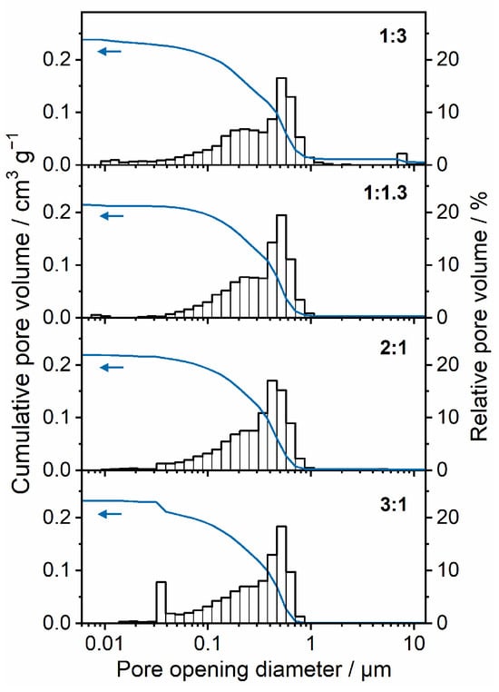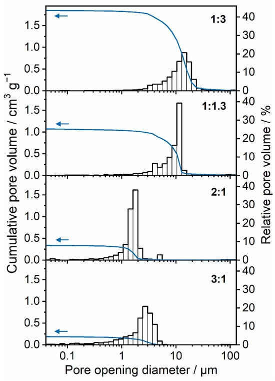 Pore opening diameter distribution of plaster mould materials prepared from varying gypsum/water ratios, determined via mercury intrusion porosimetry.