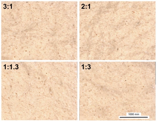 The plaster moulds consisted of two ingredients: (a) gypsum powder and (b) tap water at room temperature (24 °C). The gypsum powder used was a commercial product (Modelling gypsum produced by Krone, Germany) of calcium sulphate hemihydrate (CaSO4∙0.5H2O, “Plaster of Paris”). According to the producer’s datasheet, the above powder consisted of finely ground gypsum binder from selected natural white gypsum stone without factory additives. The set time of the above product was 15 min for the recommended gypsum powder/water (G:W) weight ratio, spanning from 5:3 to 2:1. Aiming to identify the boundaries of possible densities, we expanded the range of these mixing ratios to the maximum workability, successfully experimenting in the domain between 1:3 and 3:1. Within this range, we selected four different G:W ratios to test (1:3, 1:1.3, 2:1, and 3:1). The first two ratios were well below the provider’s suggested range (i.e., with an excess of water), the third was the maximum ratio of the suggested range, and the fourth was above the suggested range (i.e., an excess of gypsum powder).