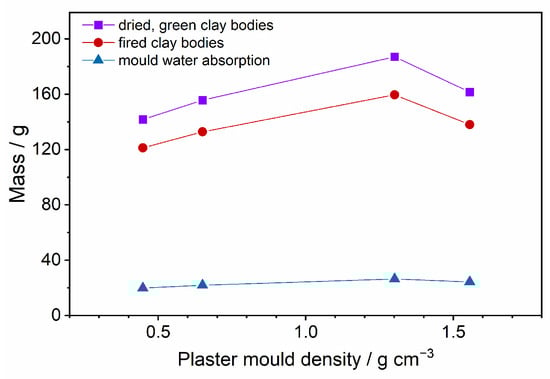 Correlation between plaster mould densities and cast/mould masses. Mass data of the four plaster clay casts of different G:W ratios (1:3, 1:1.3, 2:1, 3:1), in both dried green (purple line) and fired state (red line), as well as water absorption (blue line) of the four plaster moulds after the slip casting. Casting duration 60 min, casting area 120 × 120 mm2.