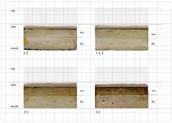 The mass of the four plaster moulds was measured with an electronic scale immediately before and after the clay slip casting process to determine the amount of water absorbed by the mould. The results (Figure 5, blue) indicate that for the first three samples (1:3, 1:1.3, 2:1) the water absorption increases linearly according to the mould density. However, the densest mould, 3:1, showed reduced water absorption in comparison to mould 2:1. A comparable linear increase is observed for the resulting mass of the four clay casts in both the dried green and fired state (Figure 5, purple and red, respectively). Finally, the cast morphology after 60 min simultaneous slip casting using the four mould material compositions is shown in Figure 6, illustrating green bodies, the moulds’ water absorption, and slip excess level.