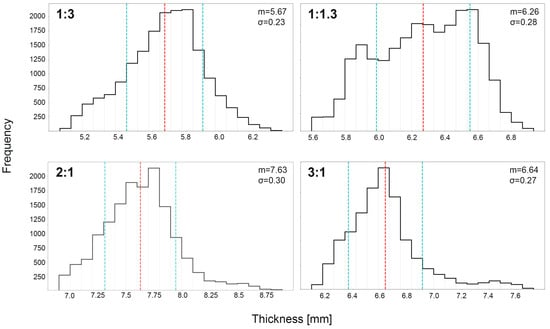 Thickness values distribution in mm of the 4 fired clay samples (75 × 75 mm2) extracted from 3D point cloud data. The mean thickness values (red) of the samples range between a minimum of 5.67 mm in mould 1:3 and a maximum of 7.63 mm in mould 2:1. Standard deviation values (blue) quantify the variability in thickness distribution across the samples’ surface in a range between ±0.30 mm in mould 2:1 and ±0.23 in mould 1:3.