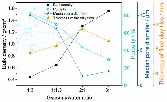 Bulk density, porosity, and median pore opening diameter of gypsum mould materials prepared from varying gypsum/water ratios, determined via mercury intrusion porosimetry, as well as the average thickness values of the respective clay casts after firing.