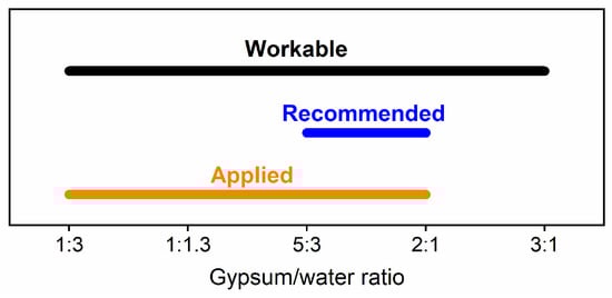 To achieve these ratios, the quantities of both ingredients were measured with an electronic scale and hand-stirred with a spatula to form the different plasters. Based on prior research, it is known that the higher the moisture content of the plaster mix, the lower the mechanical strength of the mould [10]. As expected, the tested range of mixtures exhibited a wide viscosity range: low viscosity for smaller G:W ratios and high viscosity for larger ratios. Depending on the viscosity of each mixture, both the required mixing and working time were found to differ significantly, spanning from 1 to 10 min. The mixtures were then either poured or plastered into master moulds made of water-resistant laminated wood. After 24 h, all of the plaster mixtures were hardened enough to be de-moulded, and subsequently were left to air-dry at the above-specified room conditions. Based on empirical evidence, all of the mixtures were dry within a period of 12 days.