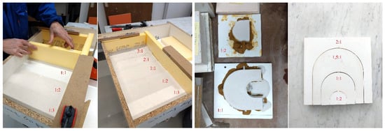 The linearly graded mould was produced by means of one adjustable formwork for plaster casting. The mould design consisted of five equally sized rectangular sections characterised by five consecutive plaster G:W ratios: 1:3, 1:2, 1:1.3, 2:1, and 3:1. It was produced in five subsequent steps, by pouring one plaster mix after the other (starting from the less viscous to the more viscous) in the formwork by enlarging its size at each pouring step (Figure 10, left). The working time of the different mixtures was variable, according to their viscosity, and spanned from 2 min (for the highest viscosity mix) to 15 min.