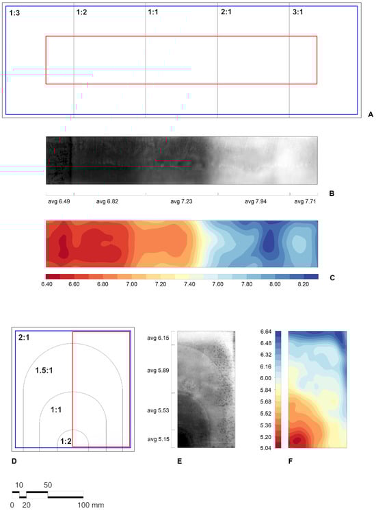 Visualization of the measured thickness values of the graded tiles: linear tile (A–C) and radial tile (D–F). For each tile we show size and position (A,D) of the 3D scanned surface (red) relative to the entire clay tile (blue) and to the plaster mould (black). The measured thickness values are rendered as: (1) grayscale height map with thickness values averaged per mould-area (B,E) confirming the correlation between plaster mould density and ceramic tile thickness; (2) colour-coded contour map at constant height steps (C,F) revealing a smooth clay thickness gradient across the variably dense plaster mould regions.