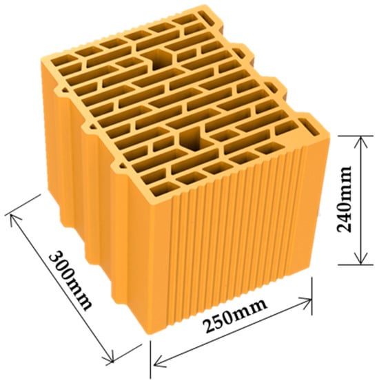 Vertically perforated bricks are a type of clay brick characterized by one or more perforations running vertically through their center, extending from the top to the bottom of the brick. Unlike hollow bricks with horizontal perforations, these bricks feature circular or rectangular openings that run in a vertical orientation. The vertical perforations enhance the brick’s surface area, facilitating improved air circulation and providing better thermal insulation [11]. This design leverages natural convection, where hot air rises and cold air sinks, to create air currents within the walls. As a result, vertically perforated bricks help maintain indoor temperatures, keeping interiors cooler in summer and warmer in winter. These bricks come in various sizes and shapes, including standard rectangular forms, corner pieces, and interlocking designs, making them suitable for a range of applications, such as load-bearing and non-load-bearing walls or for decorative purposes. For this study, SABO S.A. provided a design for a new vertical clay block introduced to the Greek market, as can be seen in Figure 1. The brick features dimensions of 240 mm in height, 300 mm in width, and 250 mm in length, and its performance was analyzed as part of the investigation.