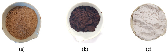 Materials used for the testing procedure: (a) TZ clay material after grinding; (b) coffee grounds residue; (c) expanded perlite residue.