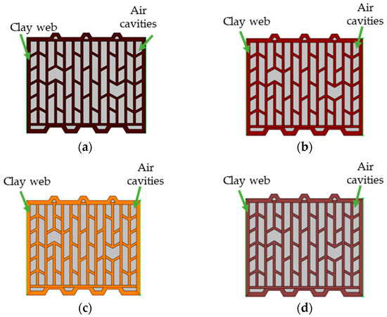 Domains of the vertically perforated bricks: (a) TZ clay, (b) TZCF mixture, (c) TZCFPW mixture, (d) TZPW mixture.