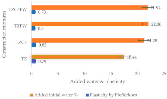 The initial water added during preparation increased with the addition of additives. The baseline clay (TZ) required 17.44 wt.% water, whereas TZCF, TZPW, and TZCFPW required 21.28 wt.%, 22.06 wt.%, and 21.94 wt.%, respectively. This trend reflects the increased absorptivity of the additives, particularly expanded perlite. Both plasticity and water content can be seen in Figure 5 for all the constructed mixtures [34].