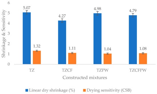 Linear drying shrinkage was highest for the baseline clay (5.07%) and decreased in the modified mixtures. TZCF showed the lowest shrinkage (4.27%), followed by TZCFPW (4.79%) and TZPW (4.98%). The lower shrinkage values indicate that the additives help mitigate deformation during drying, particularly coffee grounds [35].