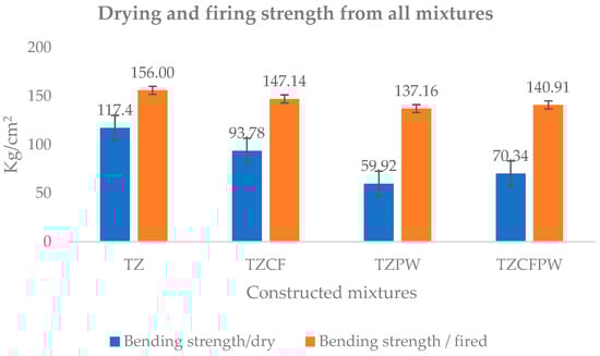 In terms of mechanical performance, the introduction of coffee grounds and expanded perlite waste resulted in a decline in both dry and fired bending strengths. The baseline clay (TZ) exhibited the highest strength, while TZPW (expanded perlite waste) had the lowest. The dry bending strength decreased from 117.40 kg/cm2 in TZ to 59.92 kg/cm2 in TZPW, while the fired bending strength was highest in TZ (156.00 kg/cm2) and lowest in TZPW (137.16 kg/cm2). This reduction can be attributed to the increased porosity introduced by the additives, which weakens the structural integrity of the bricks. The lower strength of TZPW compared to the other mixtures is primarily due to its higher porosity, as the addition of expanded perlite waste increases the number of air voids within the ceramic matrix. These air pockets act as stress concentrators, reducing the overall density and making the material more susceptible to fracture under load. Despite this reduction in strength, the fired bending strength values remained within acceptable limits for non-load-bearing masonry applications, demonstrating that these materials remain viable for non-structural and thermally insulating uses [45].