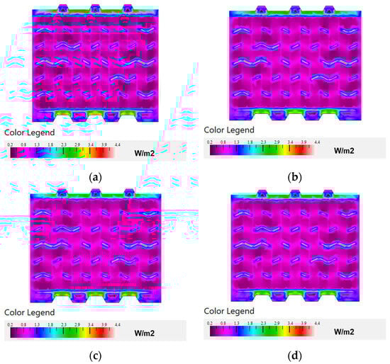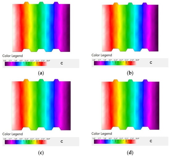 Vertically perforated bricks: (a) temperature distribution in degrees Celsius constructed from TZ clay, (b) temperature distribution in degrees Celsius constructed from TZCF mixture, (c) temperature distribution in degrees Celsius constructed from TZCF mixture, (d) temperature distribution in degrees Celsius constructed from TZCFPW mixture.