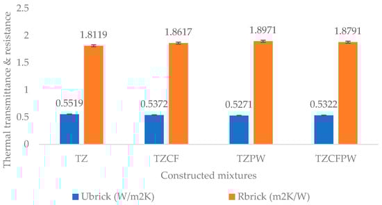 Thermal transmittance (Ubrick) and thermal resistance (Rbrick) of the tested brick for the constructed mixtures.