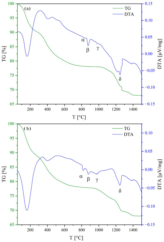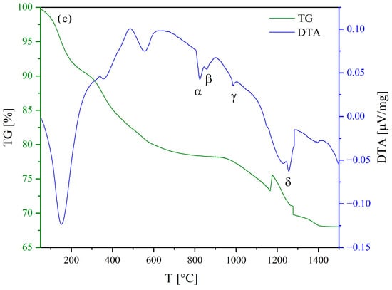 The DTA and TG curves of the three as-precipitated samples reveal a complex thermal behavior characterized by multiple events, as described in detail below (denoted with Greek letters in Figure 1). The irregularities in the TG curves in Figure 1a,c (at about 1250° and 1200 °C, respectively) are due to unpredictable instrumental issues and do not impair the following discussion.