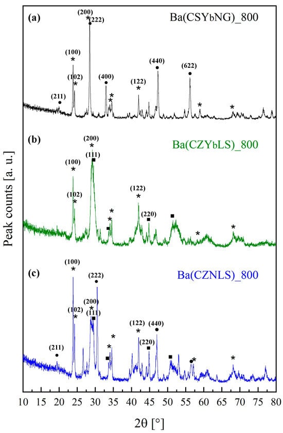 Diffraction patterns of samples Ba(CSYbNG) (a), Ba(CZYbLS) (b), and Ba(CZNLS) (c) calcined at 800 °C for 12 h (“*” stands for orthorhombic barium carbonate, “•” for bixbyite-like phases, and “▪” for fluorite-like phases).
