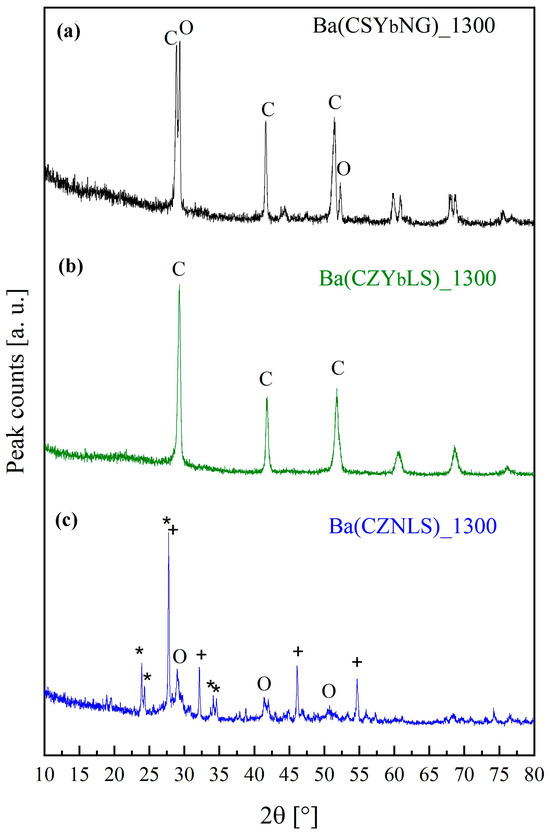Conversely, by calcination at 1300 °C for 12 h, very different behavior among the samples arose as revealed by the diffraction patterns of samples Ba(CSYbNG) (a), Ba(CZYbLS) (b), and Ba(CZNLS) (c), displayed in Figure 3.