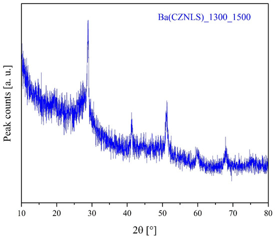 The analysis of the diffraction pattern in Figure 4 mainly reveals a noticeable loss of the sample’s crystallinity, characterized by significantly attenuated and broadened diffraction peaks emerging from an amorphous halo. The few weak peaks observable can be tentatively attributed to a fluorite-structured rare-earth-based HEO and several “hinted” peaks of barium carbonate reflections deriving from the previously formed HEPO that have withstood a significant transformation process. In fact, the pronounced alteration in the structural characteristics of the Ba(CZNLS)_1300_1500 sample is most likely attributable to interactions with the surrounding atmosphere during the post-sintering stages [49,50]. Such interactions could involve moisture absorption, barium oxide carbonation, and consequent structural degradation, leading to the observed predominance of an amorphous phase. Thus, independently of the starting conditions (already-calcined or as-precipitated) and of the extremely severe subsequent thermal treatment, Ba(CZNLS) entropy-stabilized perovskite is not chemically stable over time.