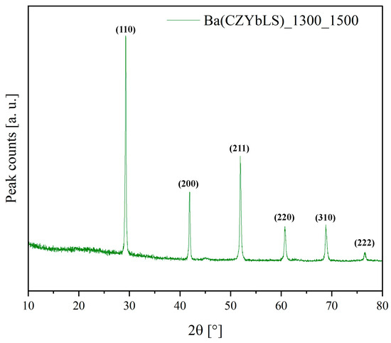 Conversely, the same thermal treatment (1500 °C for 12 h) carried out on sample Ba(CZYbLS)_1300_1500 (crushed into powders from a sintered pellet) led to the results shown in Figure 5, i.e., the entropy-stabilized cubic perovskite (ICDD card n. 01-070-3674) already observed for sample Ba(CZYbLS)_1300. Only a pronounced sharpening of the diffraction peaks due to the noticeable grain growth deriving from the harsh adopted thermal treatment can be observed.