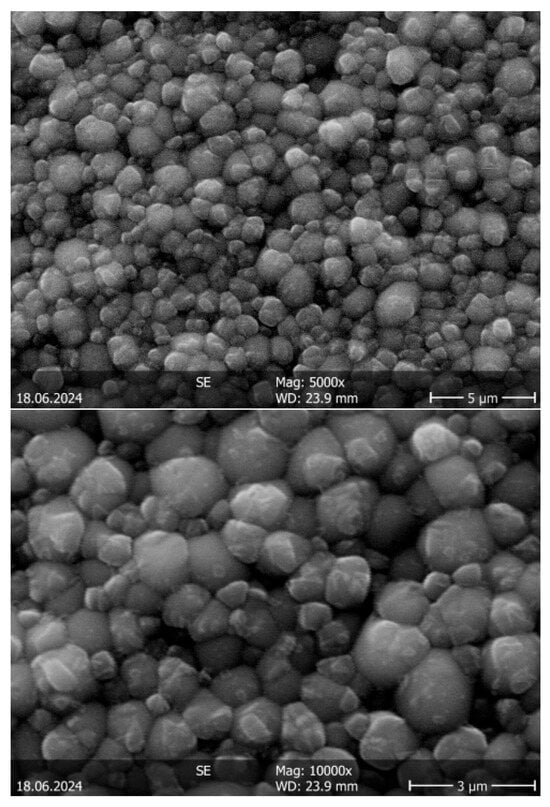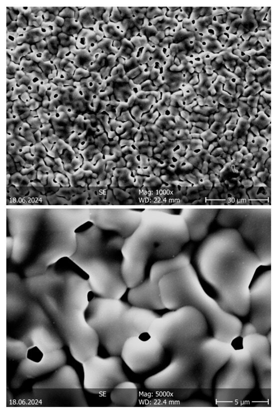 Microstructural analysis of successfully sintered pellets was conducted through scanning electron microscopy (SEM) using a Philips (Amsterdam, The Netherlands) microscope XL30.