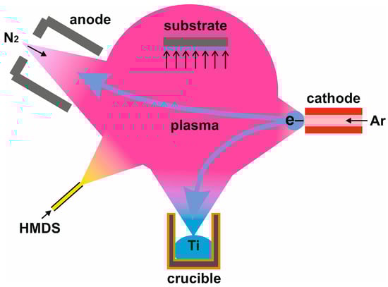 One of the most common methods for obtaining such coatings is the CVD method of thermal decomposition of liquid-phase polysilazane [6,7] and the PVD method of magnetron sputtering of two-component Si/Al targets in a mixture of nitrogen and acetylene [1]. Thermal decomposition of reactive components requires sufficiently high temperatures (over 1000 °C), and the use of a ready-made liquid precursor with a ready-made composition does not allow the composition of films to be adjusted during synthesis. The disadvantages of conventional magnetron sputtering include relatively low deposition rates, and the use of multicomponent targets complicates the process of optimizing the chemical composition of the resulting films. In addition, to obtain dense coatings with a good microstructure by the magnetron method, it is necessary to use additional plasma generators [8], since the degree of ionization of target particles is quite low [9]. An alternative to these methods may be the use of low-toxic organosilicon volatile compounds (OSC) activated in gas-discharge plasma at low pressures. Among modern plasma methods for obtaining promising metal/ceramic coatings using preceramic liquid precursors, the most common are reactive magnetron sputtering of a metal target in an OSC-containing medium [10], and reactive arc evaporation of a metal cathode in a mixture of plasma-forming gas with precursor vapor [11]. However, the deposition rate of coatings by this method is relatively low, and the coatings obtained by magnetron sputtering often have a porous structure due to the low degree of ionization of the sputtered target particles; therefore, additional plasma generators are used to increase the ion concentration in such systems. Vacuum arc methods provide high deposition rates, but it is hard to eliminate microparticles and porosity formed in the coatings; using microdrop vapor filtration systems results in a significant reduction in deposition rate and ion current density.