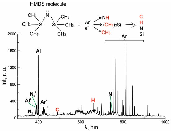 Optical emission spectra of discharge plasma in gas mixture Ar (30 sccm) + Al (1 g/h) + N2 (10 sccm) + HMDS (1 g/h).