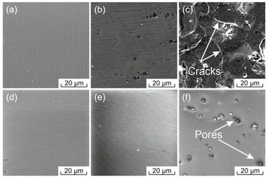 SEM images of SiAlCN coatings obtained under various synthesis conditions: QN2 = 0 sccm, QHMDS = 1 g/h, Us = –100 V and Icr = 6 A (a), Icr = 8 A (b), Icr = 10 A (c); QN2 = 10 sccm, QHMDS = 0.5 g/h, Icr = 6 A and Us = –300 V (d), Us = –200 V (e), Us = 0 V (f).