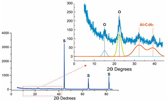 X-ray diffraction (XRD) analysis showed that the coatings obtained at Icr = 5 A were practically X-ray amorphous (Figure 5); however, weak peaks were found in the region of small angles 25–43°, which may be due to the presence of aluminum carbonitride Al7C3N3 with orthorhombic symmetry and lattice parameters a = 3.24 Å, b = 5.66 Å, and c = 31.68 Å with an average crystallite size of 3.7 nm. At low Icr (lower 4 A), such peaks were not observed. Typically, coatings of this type are amorphous [19], and temperatures above 1000 °C are required under normal conditions to obtain nanocrystalline phases (AlCN, SiC, or SiN) [20].