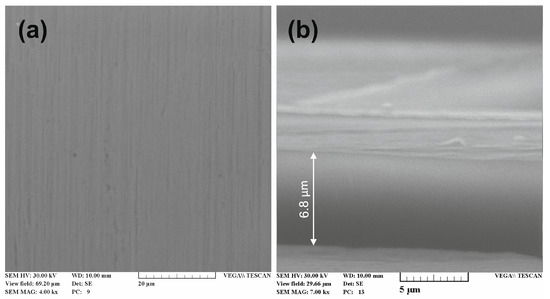 SEM images of the surface (a) and the cross section (b) of resulting SiAlCN coatings.